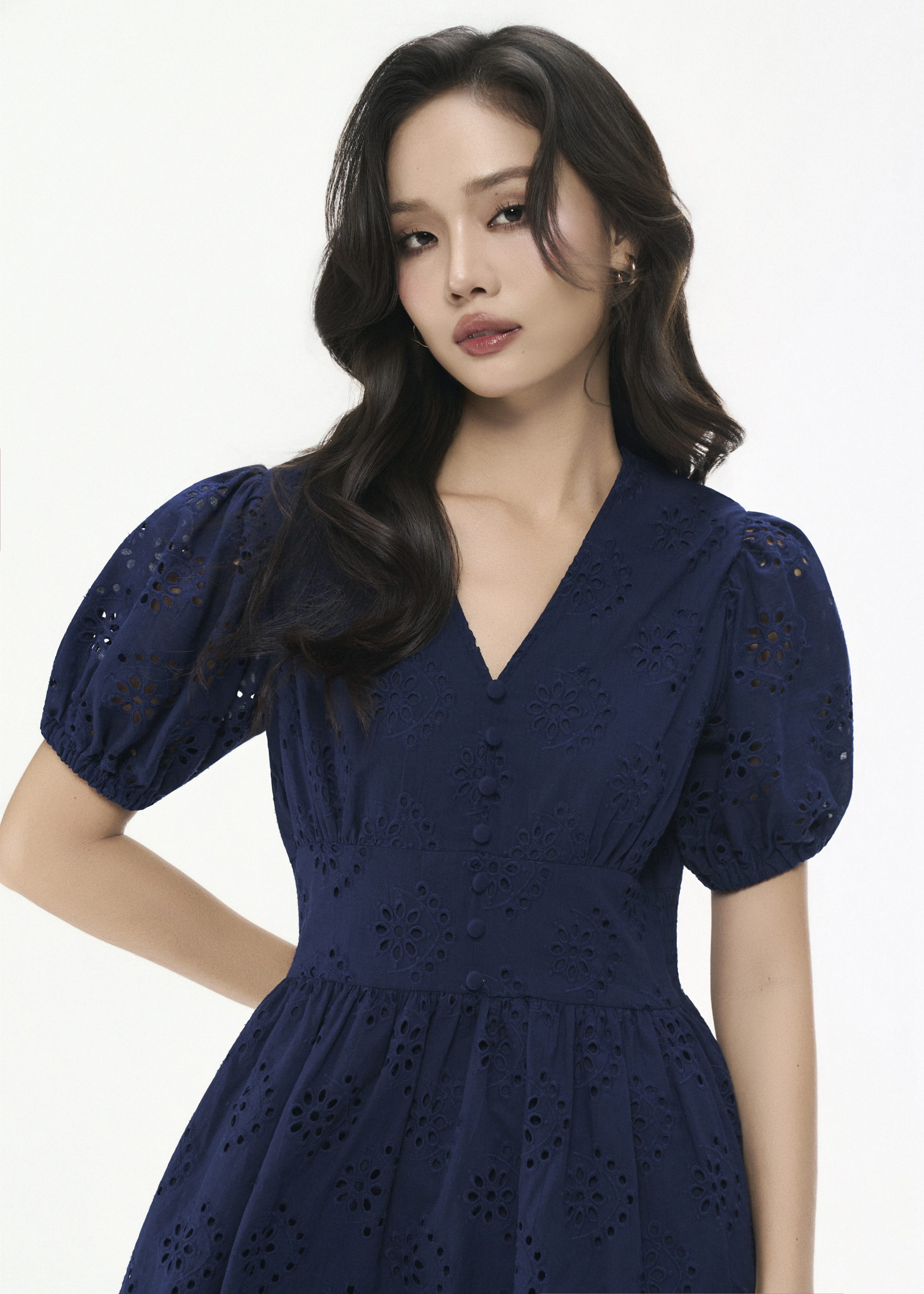 - Breathable linen fabric in a deep midnight blue tone, detailed with floral cutwork embroidery for a refined yet airy feel